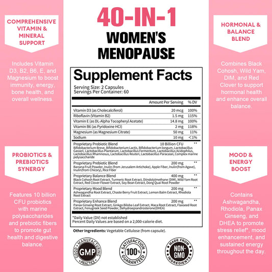 40-in-1 Menopause Supplements for Women, Multibenefit & Complete Black Cohosh for Hot Flashes, Night Sweats & Hormone Balance, w/ Probiotics, DIM, Vitex, Dong Quai, Red Clover and More, 120 Vegan Caps