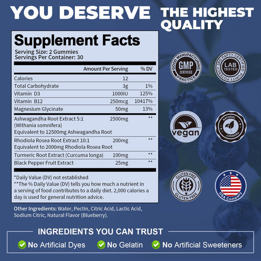 Ashwagandha Filled Gummies 12500mg w/ Magnesium Glycinate, Rhodiola Rosea, Ultra Strength Ashwagandha Supplements for Women & Wen, for Relaxation, Energy, Cortisol Health, Blueberry Flavor, 60 Count
