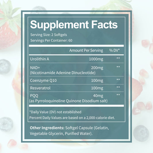 Urolithin A Supplement 1000mg with NAD+,CoQ10,Resveratrol,PQQ Supplement for Men Women 120 Softgels for Muscle Energy Antioxidants Vegan High Bioavailability