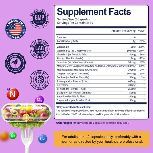 Thyroid Support Supplement Complex Capsules - Iodine Thyroid Supplement with L Tyrosine Bladderwrack Kelp Ashwagandha Selenium Supplements for Women & Man - Mood Enhancer Energy Blance Thyroid Level