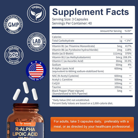 R Alpha Lipoic Acid 600mg - ALA Supplement Capsules for Neuropathy Support Supplement Antioxidant, Nerve Health, Liver Detox, Metabolism and Cell Energy, Anti-Aging, Non-GMO, Gluten Free, Vegan Safe