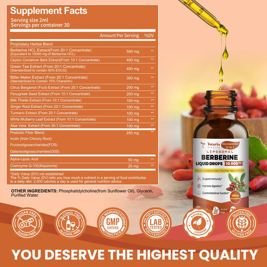Liposomal Berberine HCl Supplement Activates AMPK & GLP-1, 10000mg (20:1 Extract) Liposomal Berberine with Green Tea, Ceylon Cinnamon Liquid Drops Supports Antioxidant, Digestive, Weight