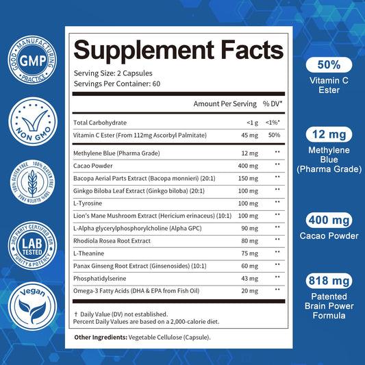 USP Grade Methylene Blue Capsules - Vitamin C, Cacao Powder, Bacopa, Ginkgo Biloba, L-Tyrosine, Alpha GPC, Rhodiola Rosea, L-Theanine, Panax Ginseng Supplement, 120 Count