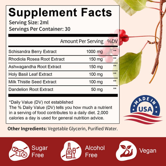 Schisandra Supplement 6-in-1 Schisandra Berry Drops with Rhodiola Rosea, Ashwagandha, Holy Basil, Milk Thistle, Dandelion Root Adaptogen for Mood Stress Liver Health 2Fl.Oz