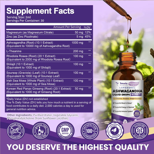 Liposomal Ashwagandha Liquid Drops w/Soursop, L-Theanine, Shilajit, 10000mg (10:1 Extract) Maximum Absorption, Natural Calm, Energy, Cortisol Health for Women & Men, Non-GMO, Alcohol Free