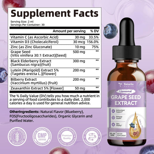 Grape Seed Extract Liquid Drops | High Potency 95% Polyphenols Antioxidant Supplement for Skin, Heart & Immune Support | Vegan, Gluten Free | Alcohol-Free & Non-GMO | 2FL