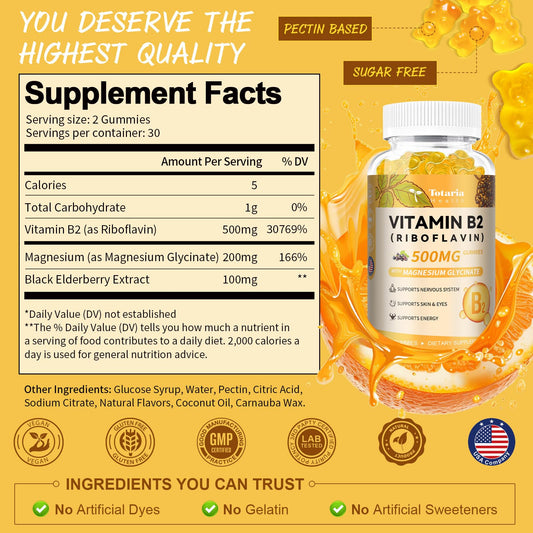 Totaria Vitamin B2 Gummies, Riboflavin 500mg Supplement for Kids & Adults with Magnesium Glycinate & Elderberry, Energy, Skin & Nervous System Support, Vegan, Sugar Free, 60 Chewable Gummies
