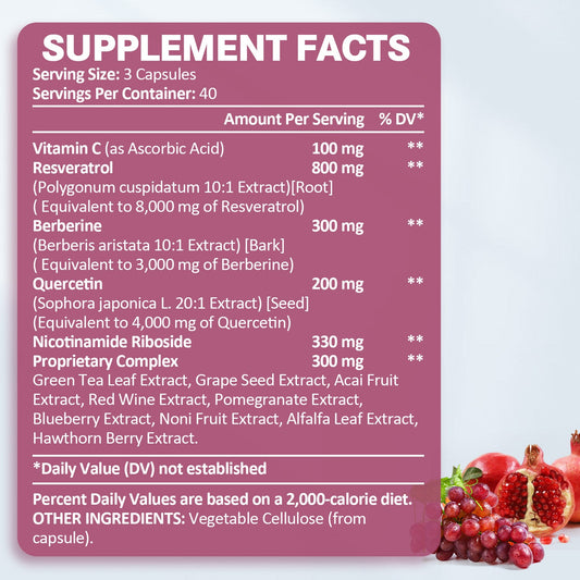 Resveratrol Supplement 8000mg Extra Strength with Berberine Quercetin Green Tea Extract Grape Seed Extract Polyphenol Antioxidant Supplement Antioxidant & Heart Health Support 120 Capsules