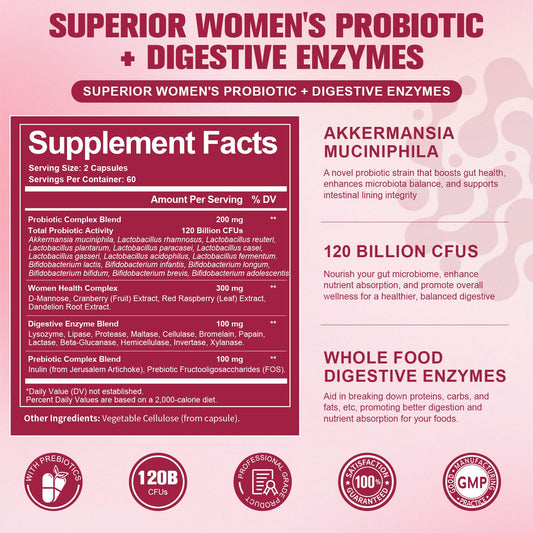 Probiotics for Women, 120 Billion Women Probiotic, Digestive Enzymes & Prebiotics, with Akkermansia, Cranberry, D-Mannose, for Gut, Vaginal, Urinary, Immune, PH Balance, 120 Vegan