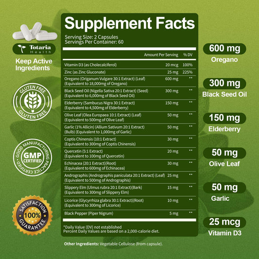 Oil of Oregano with Black Seed Oil Capsules High Absorption with Garlic,Olive Leaf,Quercetin,Black Pepper and More Supplement for Women and Men Immune Support Digestive Health 120 Counts