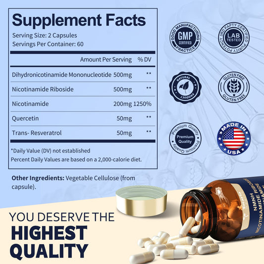NMNH (Dihydronicotinamide Mononucleotide), NMN Supplement Alternative w/ Niacinamide (Vitamin B3), Quercetin, Trans-Resveratrol, Support NAD+, Skin Cell Health*, Anti-aging & Energy, 120 Caps