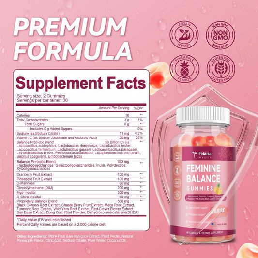 Premium Feminine Balance Gummies Sugar Free Multivitamin Gummies for Women PH Balance Vitality & Gut Health Support Pineapple Flavor 60 Count