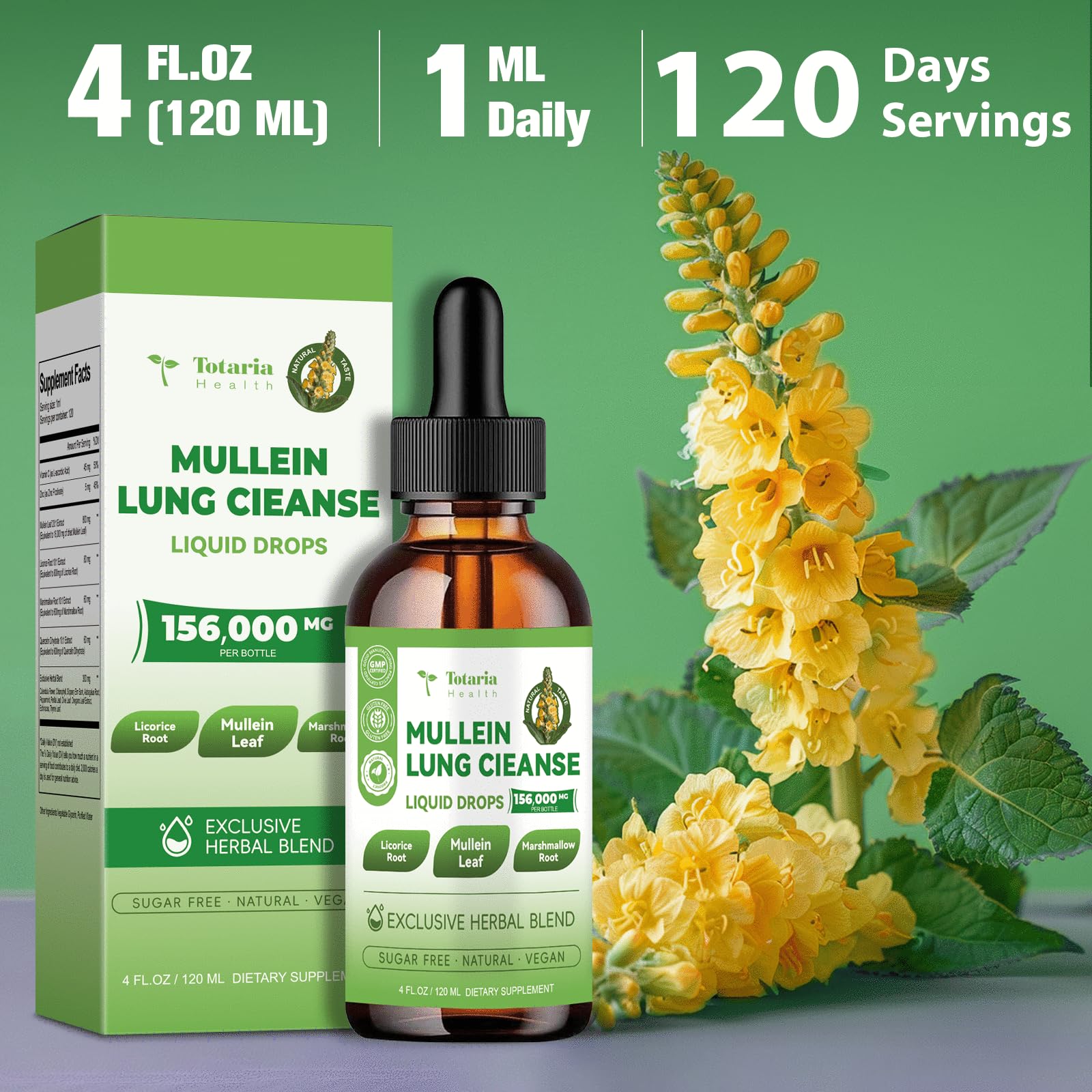 - Reliable & Customer First: Totaria 16-in-1 Mullein Drops for lungs. which are natural and vegan. gluten-free. no additives. pesticides-free. GMP compliant production. safe and reliable. Your satisfaction is of great importance to us. If there is any questions about our products. please feel free to contact our customer service.