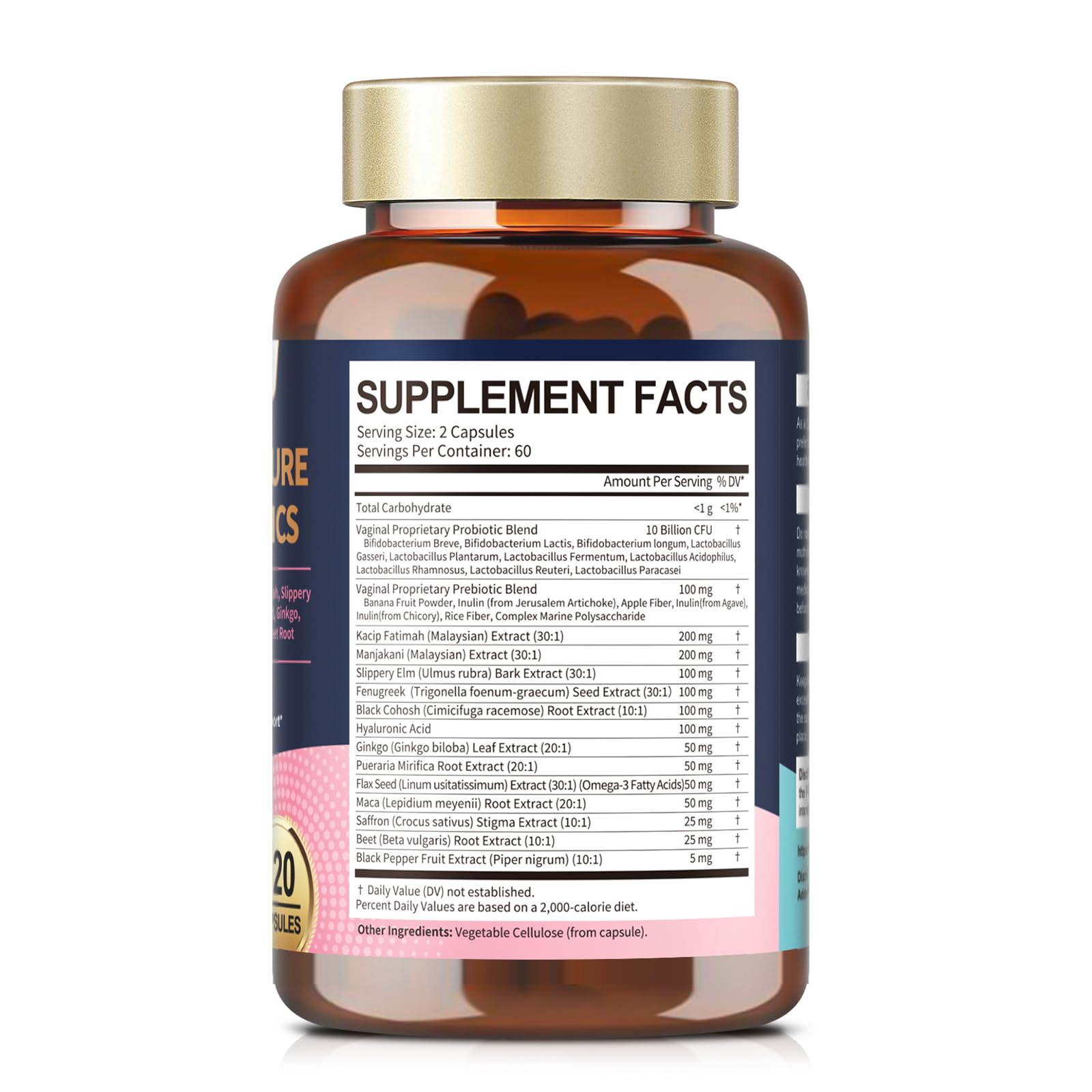 - NATURAL INGREDIENTS FOR ENHANCED HYDRATION: Enriched with Hyaluronic Acid. Slippery Elm Bark. and other natural moisturizers. these capsules help maintain optimal vaginal hydration levels. Ingredients like Kacip Fatimah. Manjakani. and Pueraria Mirifica Root are also included to support overall intimate health.