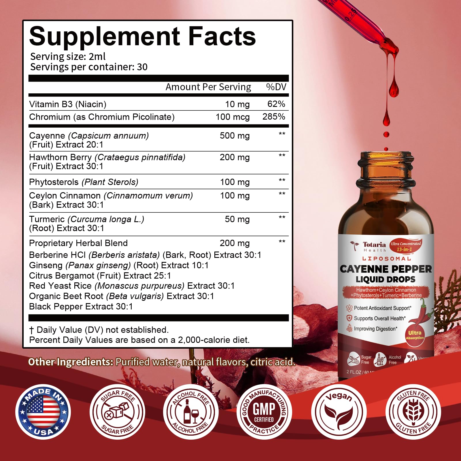 Cayenne Pepper Drops Liposomal Liquid Supplement, 13-in-1 Cayenne Pepper Drops with Vitamin B3, Hawthorn Berry, Panax Ginseng, Berberine, Beet Root, Ceylon Cinnamon, Turmeric Curcumin Extract