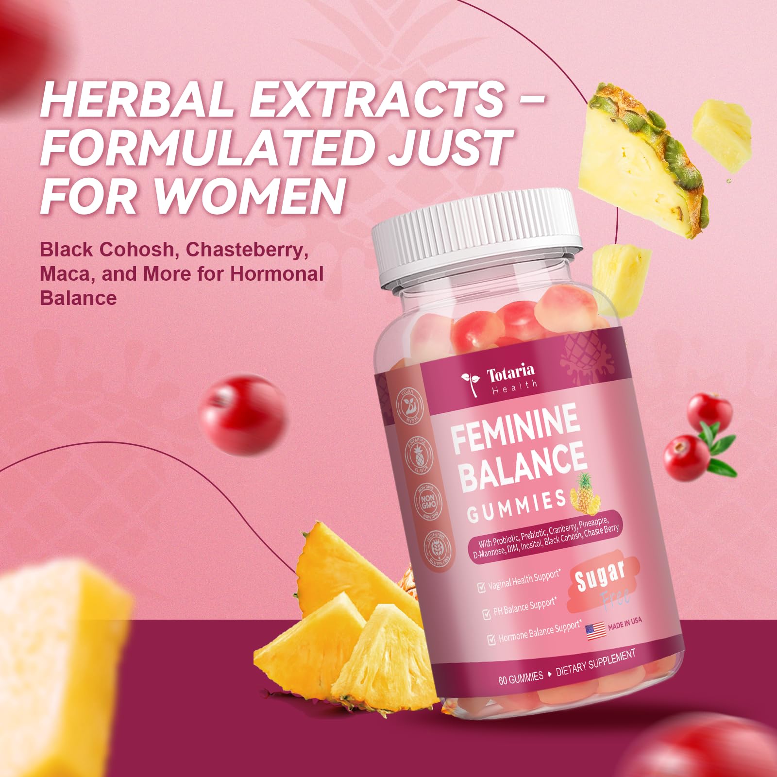Premium Feminine Balance Gummies Sugar Free Multivitamin Gummies for Women PH Balance Vitality & Gut Health Support Pineapple Flavor 60 Count
