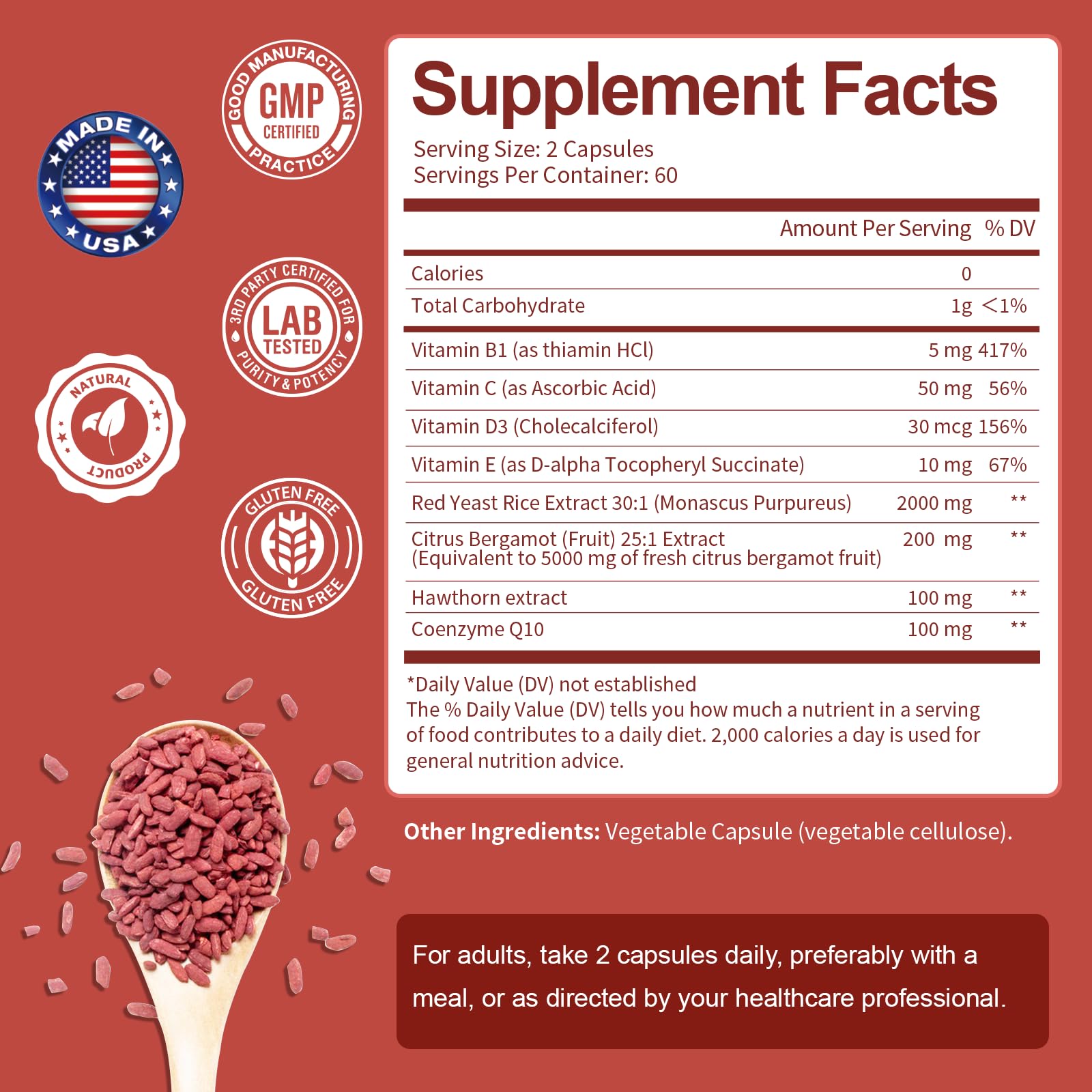 - Better than Other Brands - Our red yeast rice with CoQ10 supplement contains 2000mg of red yeast rice. 100mg of coenzyme q10. 200mg of citrus bergamot. 100mg of hawthorn. and 65mg of multi-vitamins in each serving to help maximize support your heart and body's health.