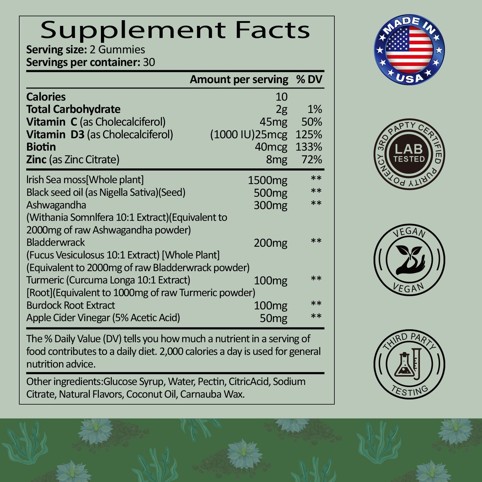 Sea Moss Black Seed Oil Gummies Extracts from Irish Seamoss Whole Plant Advanced with Black Seed Oil, Ashwagandha Burdock Root Turmeric Bladderwrack - Support Immune, Joints, Digestion, Hair & Skin