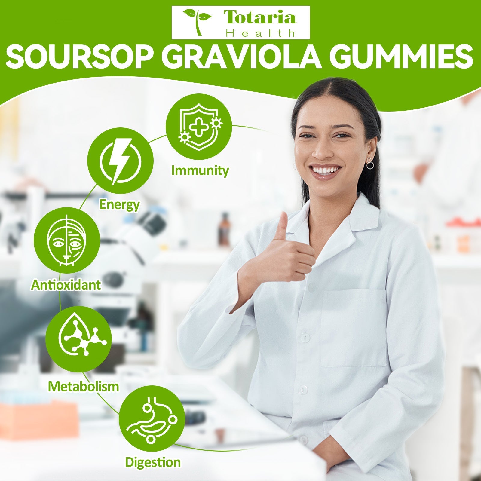 - Multiple Benefits: Totaria 5000mg powerful soursop gummies are rich in Soursop Graviola Leaves. which are antioxidant and support energy. immunity. metabolism. digestive health and help you Zzz better. Just 2 Gummies a day. Better Life. Better You!